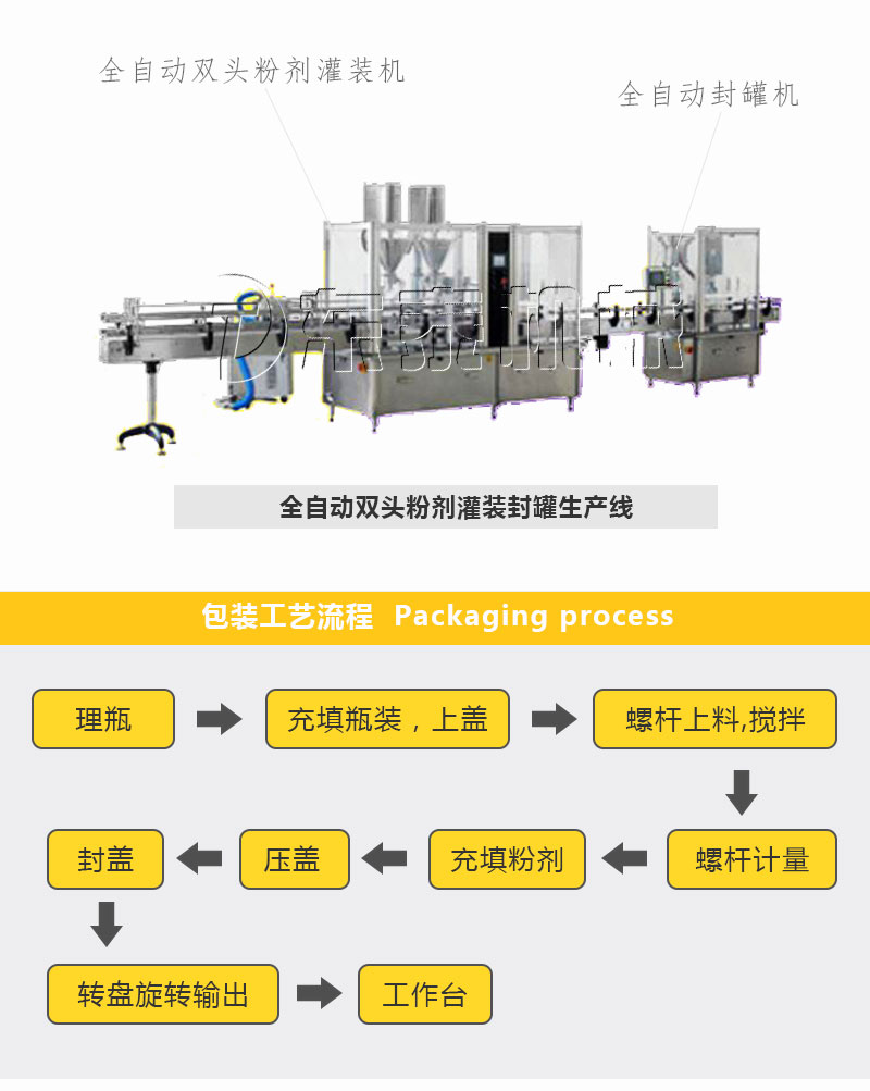 全自動(dòng)粉劑灌裝機(jī)是我公司的主打產(chǎn)品,根據(jù)客戶的要求公司開發(fā)出了單頭、雙頭、四頭、六頭瓶裝生產(chǎn)線,全自動(dòng)奶粉灌裝機(jī)專門針對(duì)藥品、保健品、食品行業(yè)的粉劑瓶裝。結(jié)合不同的客戶需求可配套:上料(螺桿、真空)、自動(dòng)理瓶,單(雙)頭加塞、旋蓋、軋蓋、壓蓋等,鋁箔封口(風(fēng)冷、水冷),金檢,鋁箔塞墊,貼標(biāo),碼瓶熱收縮,裝盒,三維包裝(帶金線),裝箱等。