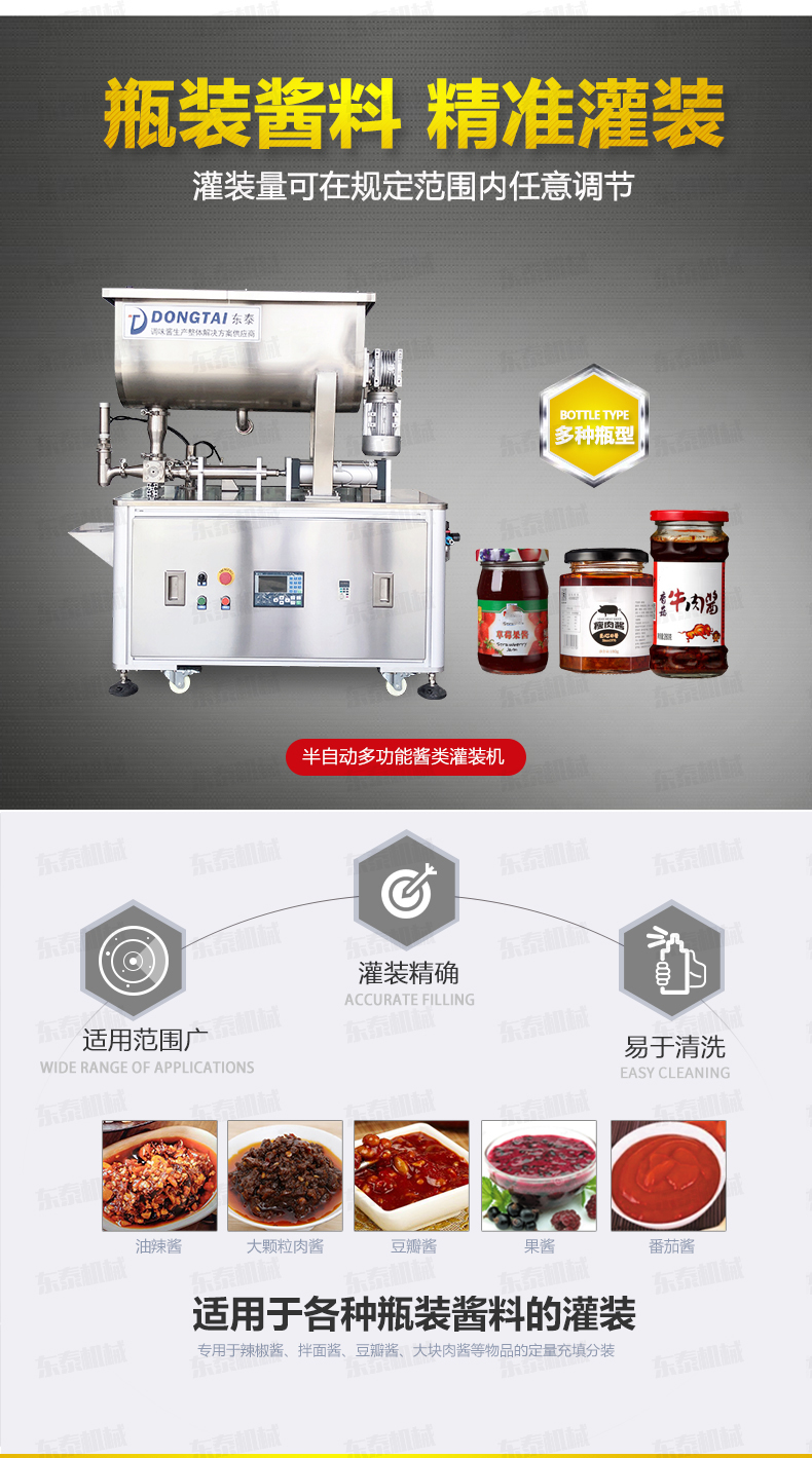 半自動(dòng)灌裝機(jī)械,配置的自動(dòng)攪拌器,保證了醬和油的充分混合,可灌裝顆粒漿狀流體物料在對(duì)辣椒醬、拌面醬、豆鼓等醬類進(jìn)行灌裝時(shí),灌裝量可在規(guī)定范圍內(nèi)任意調(diào)節(jié),計(jì)量誤差小,該半自動(dòng)醬類灌裝機(jī)采用壓縮空氣為動(dòng)力可在各種環(huán)境中使用。
