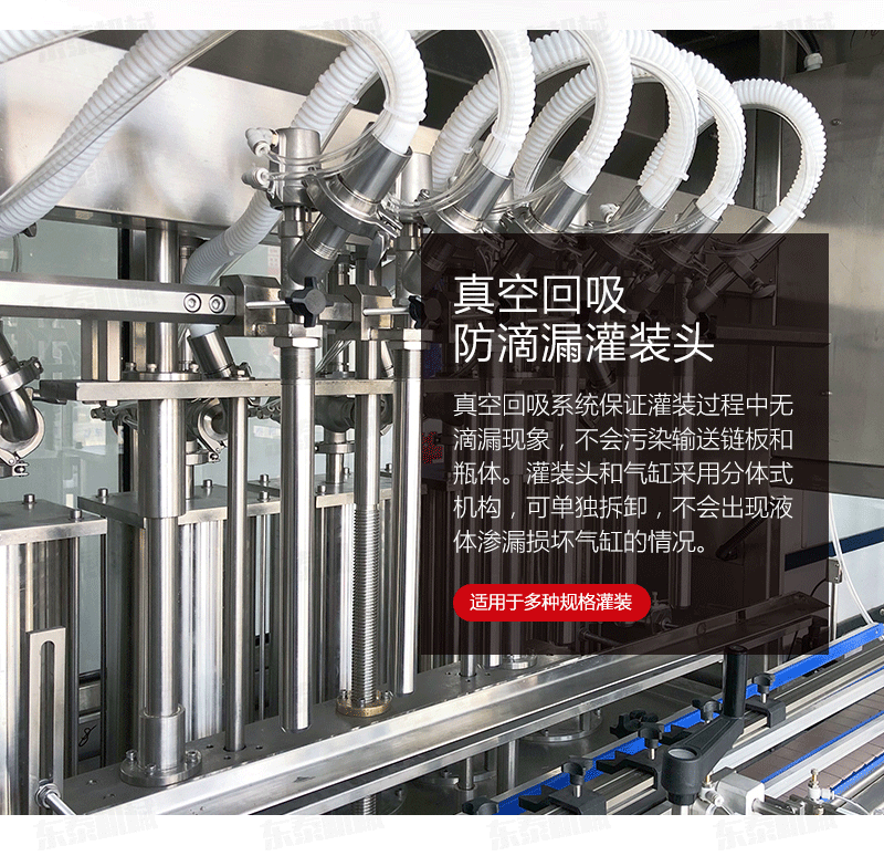 1.真空回吸系統(tǒng)保證灌裝過程中無滴漏現(xiàn)象,不會污染輸送鏈板和瓶體。灌裝頭和氣缸采用分體式機構(gòu),可單獨拆卸,不會出現(xiàn)液體滲漏損壞氣缸的情況。進(jìn)口亞德客氣缸經(jīng)久耐用,其他密封等配件使用標(biāo)準(zhǔn)件,更換維護(hù)簡單方便。