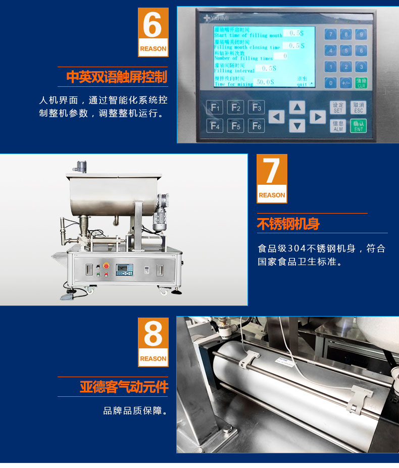 此款醬類灌裝機為觸摸屏操作,由PLC控制,自動化程度高。主要適用于番茄醬、甜面醬、沙拉醬等醬類的灌裝。