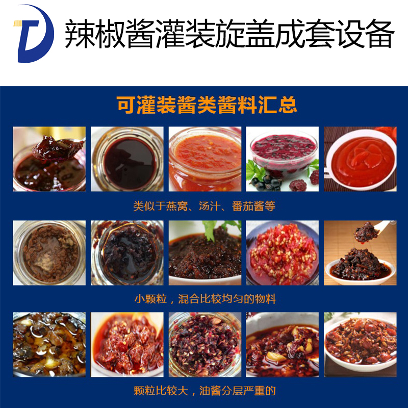 辣椒醬灌裝機采用活塞式灌裝原理,適用于調(diào)味品中帶顆粒并且濃度較大的辣椒醬、豆瓣醬、花生醬、香菇醬、果醬、牛油火鍋底料、紅油火鍋底料、蝦醬等較為粘稠醬類的灌裝。