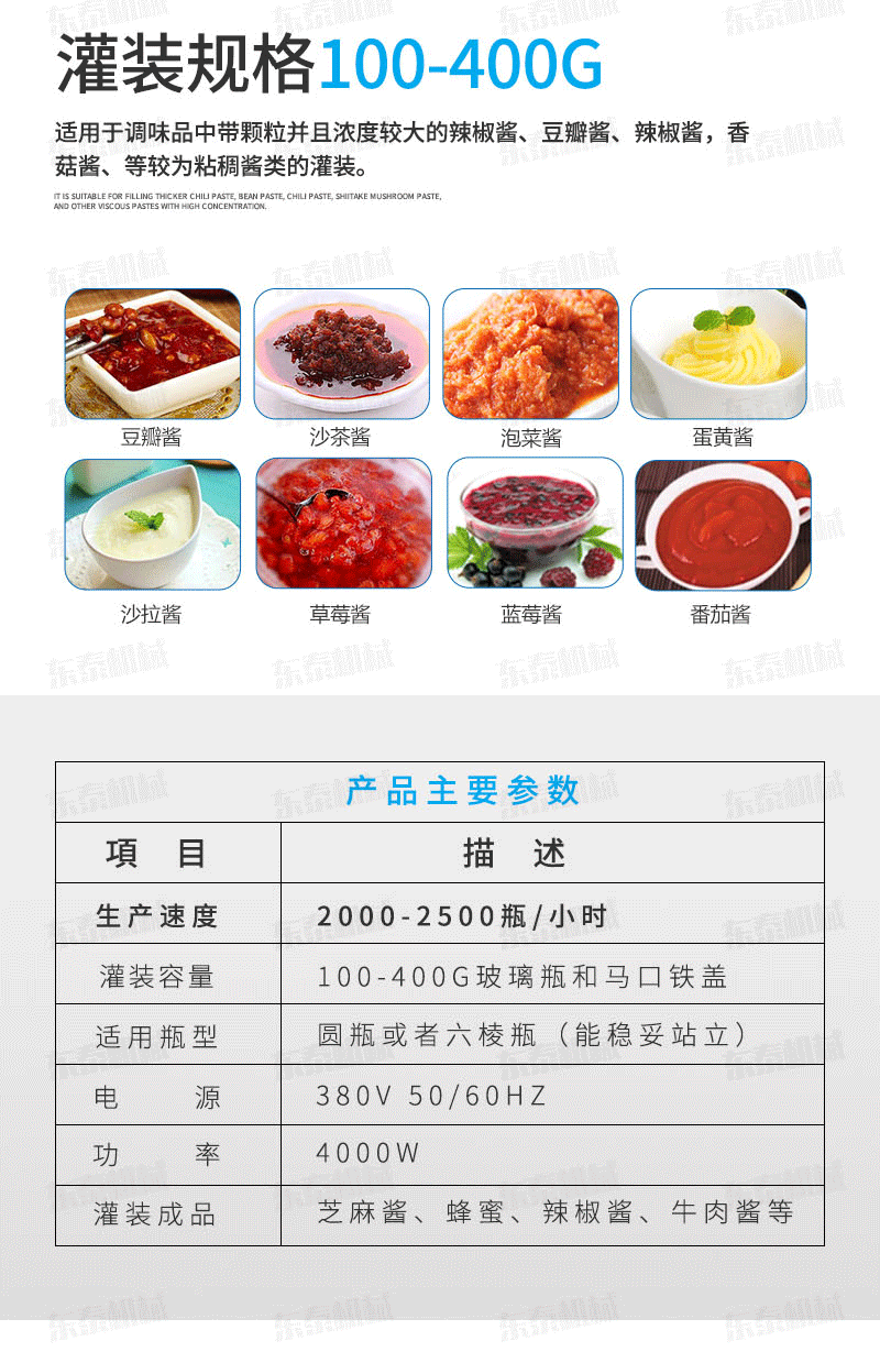 番茄醬是由西方傳入中國的一種新食品,是番茄醬加糖、食鹽在色拉油里炒熟而制成的,呈紅褐色、醬狀、體質細膩、味酸甜,微有香辣味,還可以烹飪甜辣風味的菜肴,做出的食品更誘人食欲,是人們喜愛的生活調味品之一。近幾年,沙司番茄醬的需求量呈逐年增長的趨勢發展,不僅在歐美地區,國內市場對它的需求也在不斷增多,隨著沙司口味的不斷增多,番茄醬灌裝機生產線的需求量也在增多,該全自動番茄醬灌裝機生產線是迅捷機械借鑒國外技術,自行研發的一款新一代灌裝機,設計合理,運行可靠。