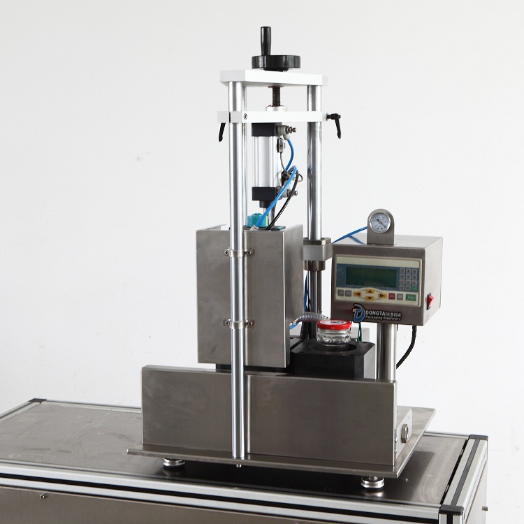 待加蓋的瓶子是手動進料和手動卸載的。在加蓋過程中,瓶子正好放在旋轉(zhuǎn)的蓋帽上方,蓋子上蓋有蓋子。密封頭具有內(nèi)置的垂直運動,其中帶有蓋子的瓶子置于其下方收緊。